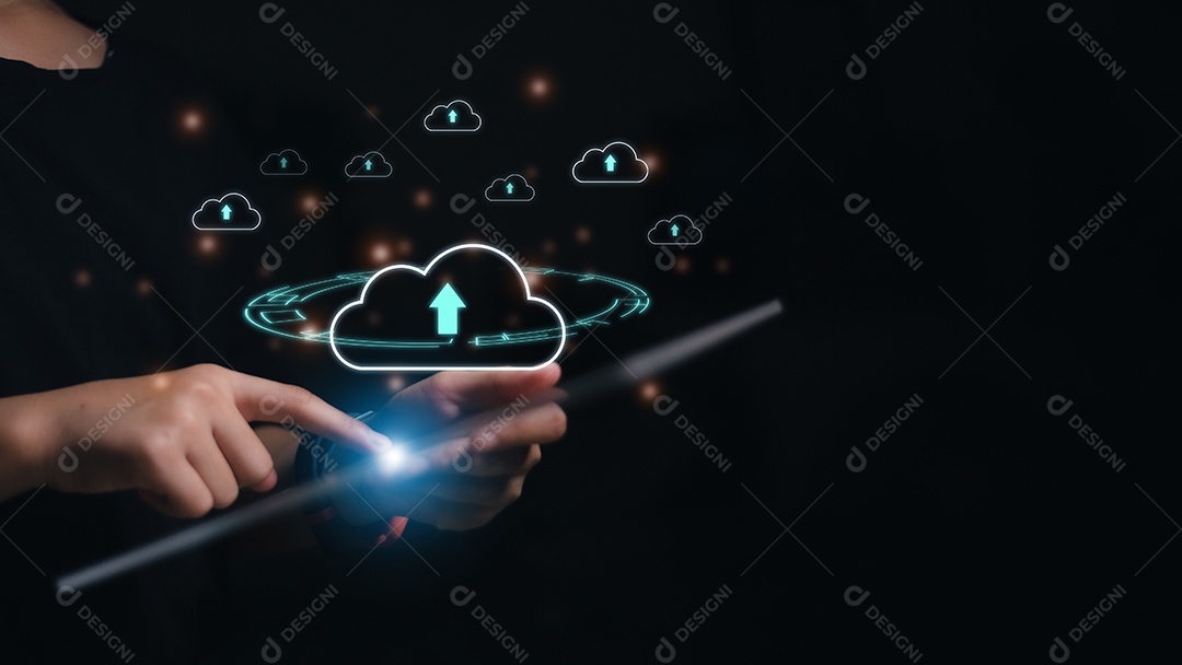 Mão segurando smartphone e laptop com diagrama de computação em nuvem mostrado na mão. Tecnologia de nuvem.