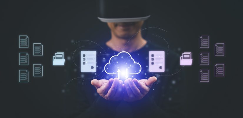 Sistema de gerenciamento de documentos de pasta DMS Pasta de arquivo aberta com documentos em branco voadores com computador.