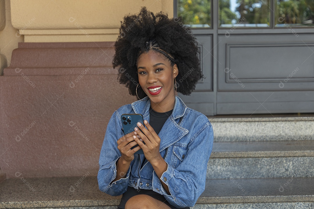 Linda mulher jovem negra cabelo afro mexendo em seu celular
