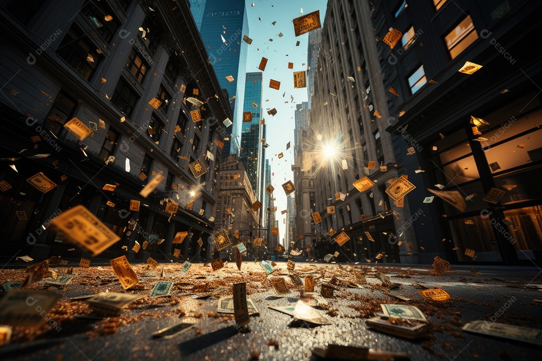 Arranha-céu reflete dinamismo financeiro em multidão apressada e gráficos, notas dançantes.