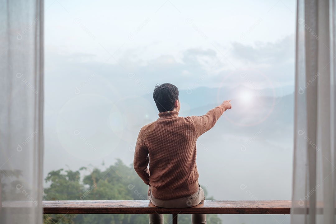 Homem turista feliz relaxando e olhando a vista para a montanha no ...