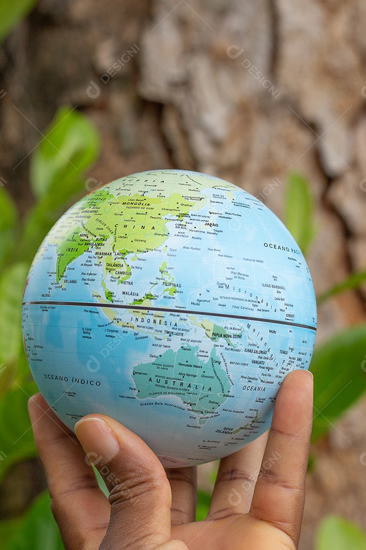 Mão segurando um globo terrestre com fundo de textura de madeira