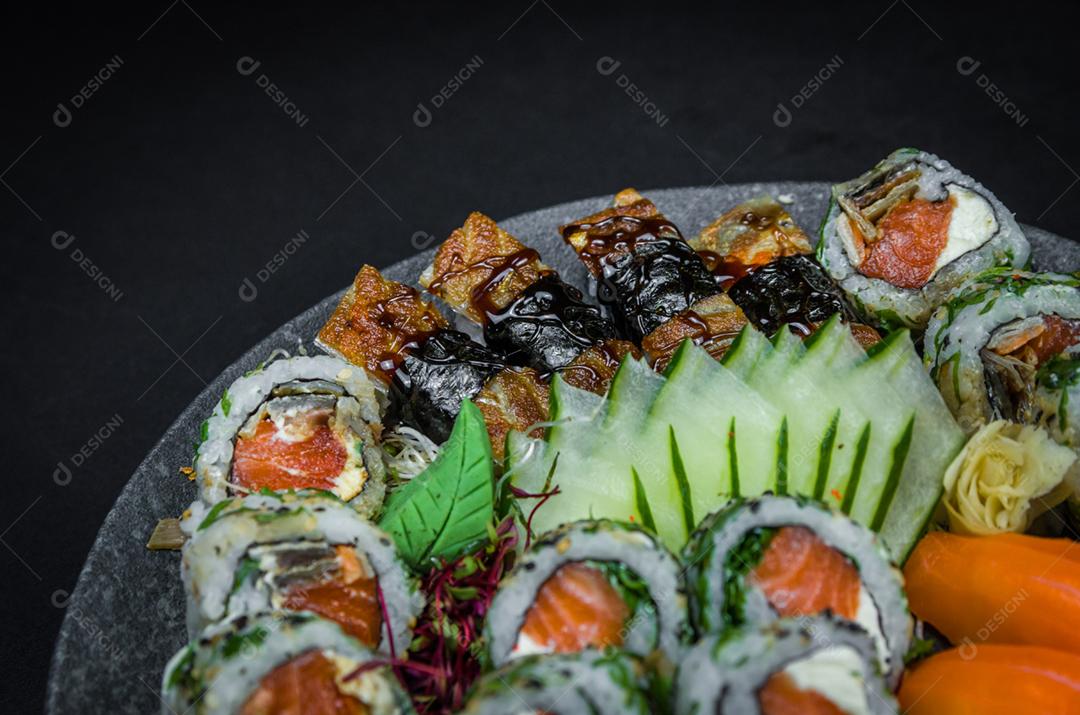 Sushi, cozinha tradicional japonesa. Vários deliciosos sushis no prato decorado, fundo preto