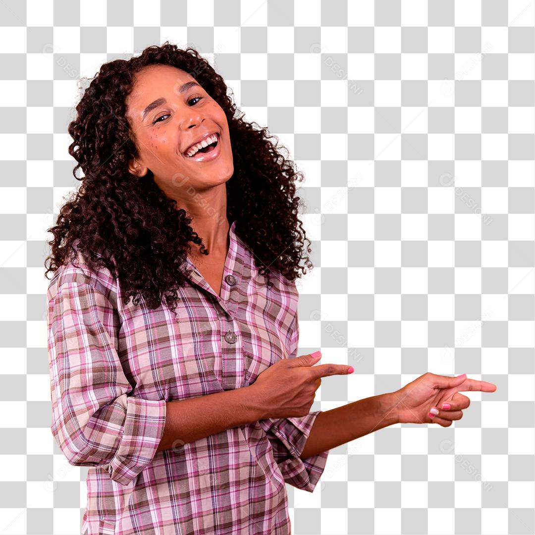 Mulher morena com traje de festa junina apontando para o lado São João