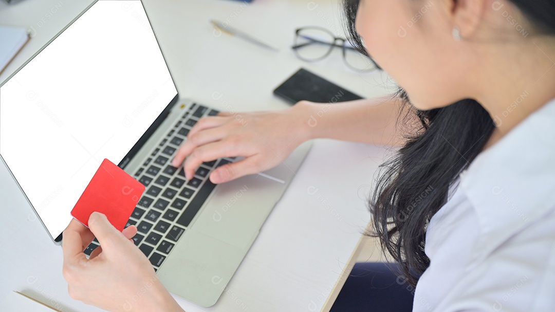 Cartão de crédito na mão da mulher. Ela está usando um laptop para pagar pelo serviço.