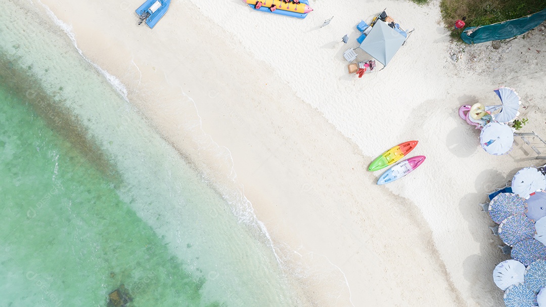 Férias de verão do conceito de praia natural. Natureza da praia tropical de verão. Guarda-chuva a bordo de um barco e barco na Praia de Areia e Turismo Feliz por brincar na areia.