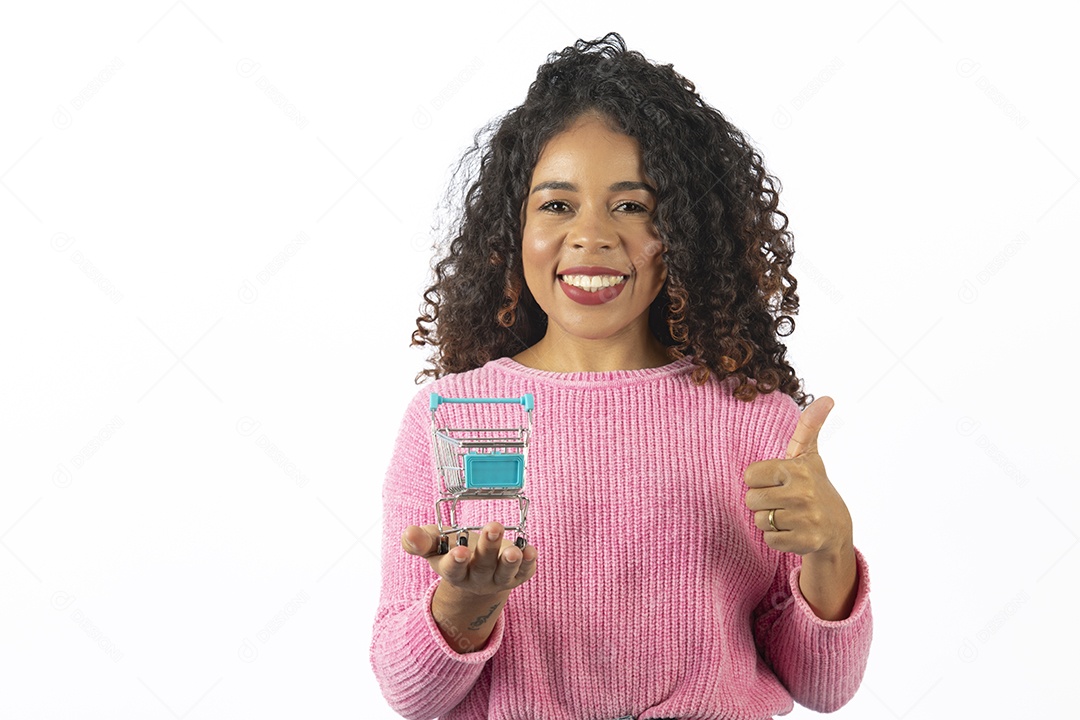 Mulher linda jovem segurando carrinho de compras sobre fundo isolado