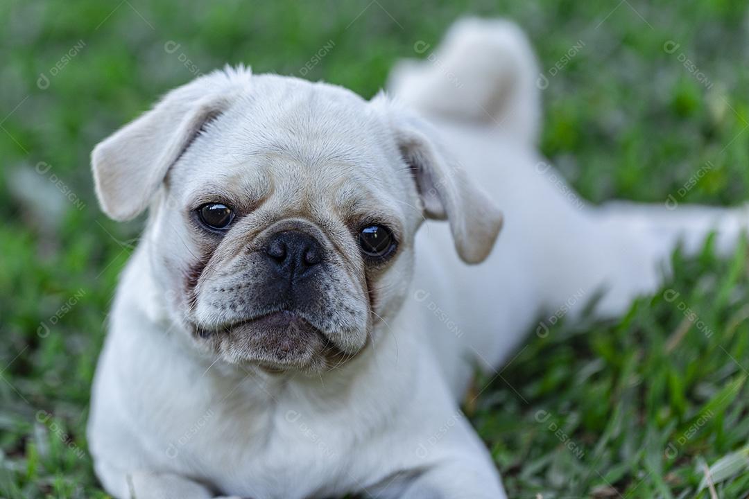 Cão de raça Pug branco deitado descansando na grama Imagem JPG