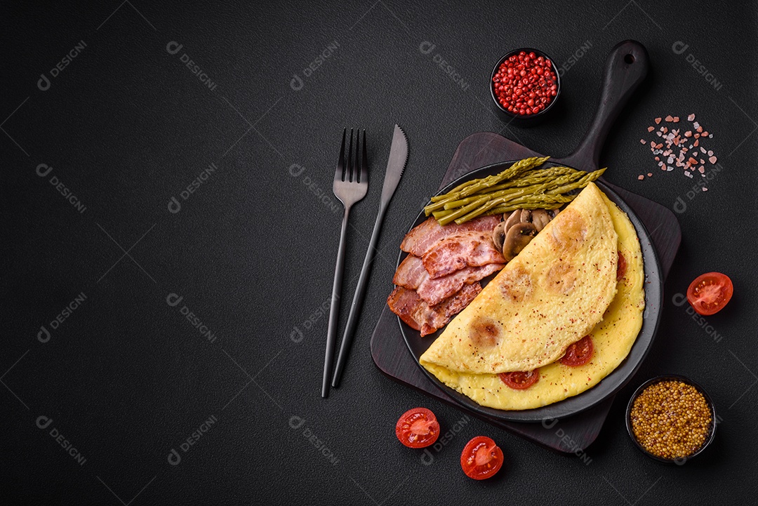 Deliciosa omelete fresca com tomate cereja, bacon, aspargos e especiarias sobre um fundo escuro de concreto