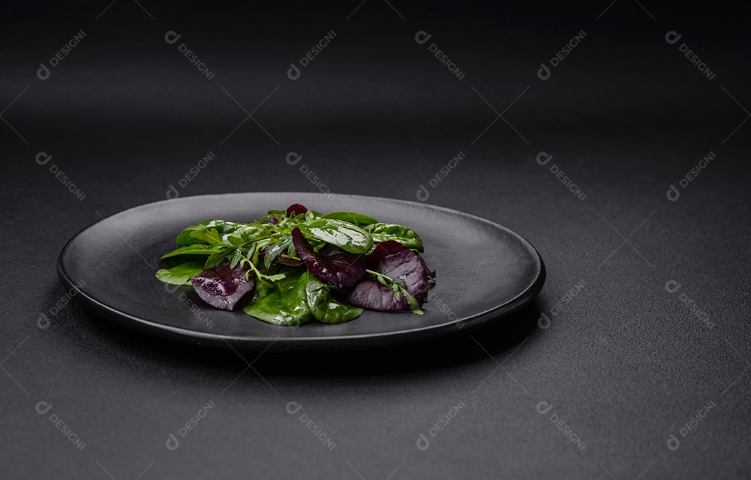 Deliciosa salada fresca composta por espinafre, acelga, radicchio, gráfico vermelho, sangue de touros e rúcula em uma placa preta sobre um fundo escuro de concreto