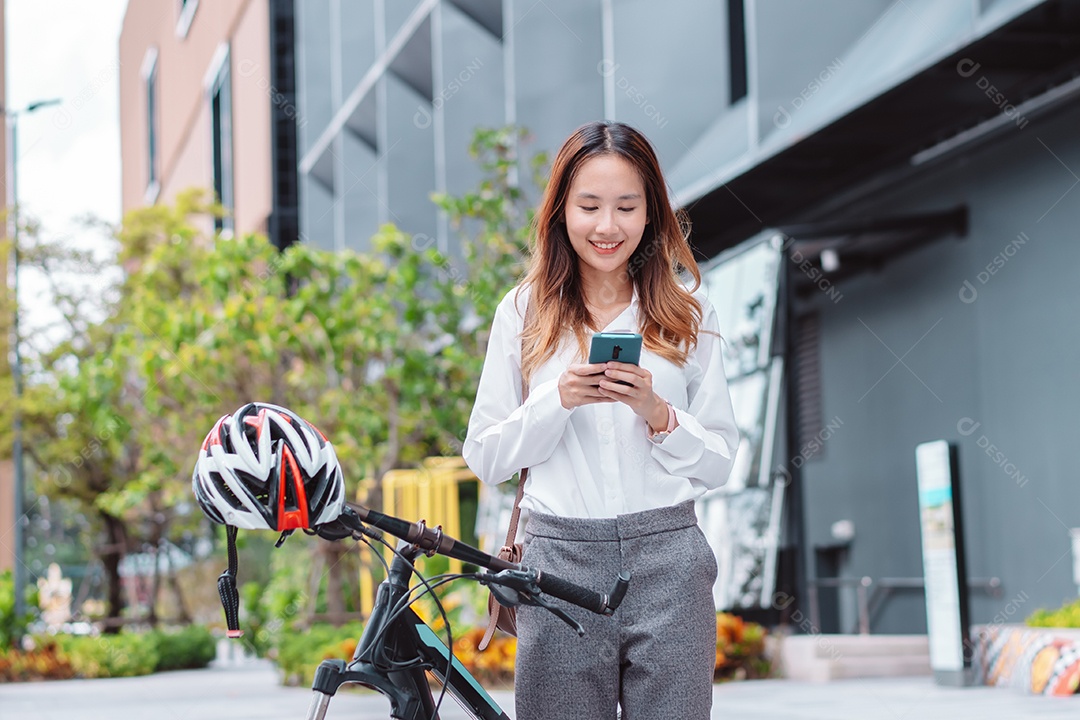 Linda mulher asiática sorridente com bicicleta falando ao celular