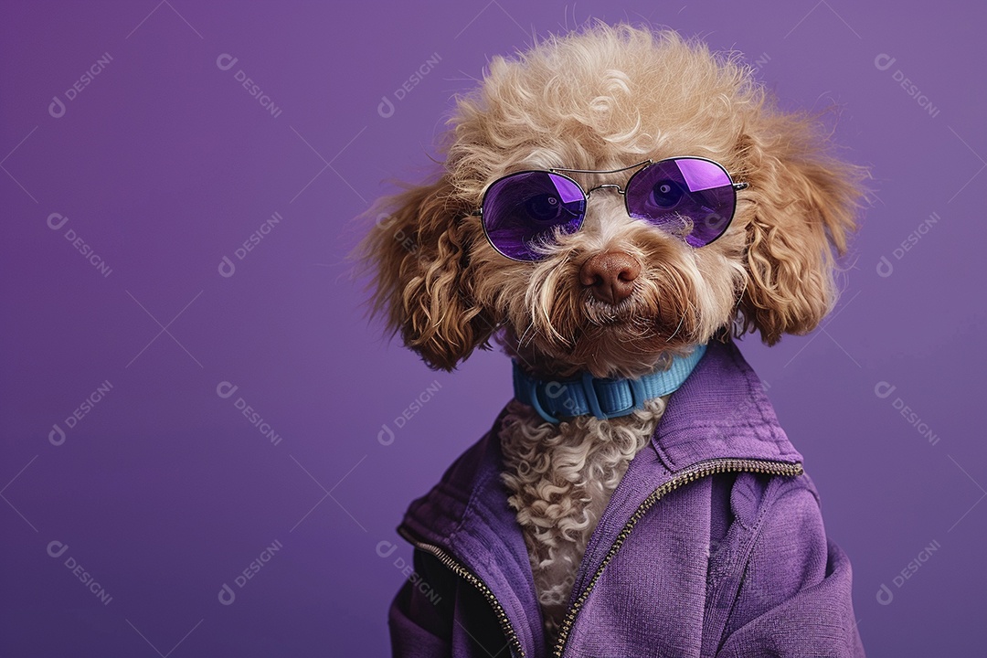 Poodle vestindo roupas e óculos de sol em fundo isolado