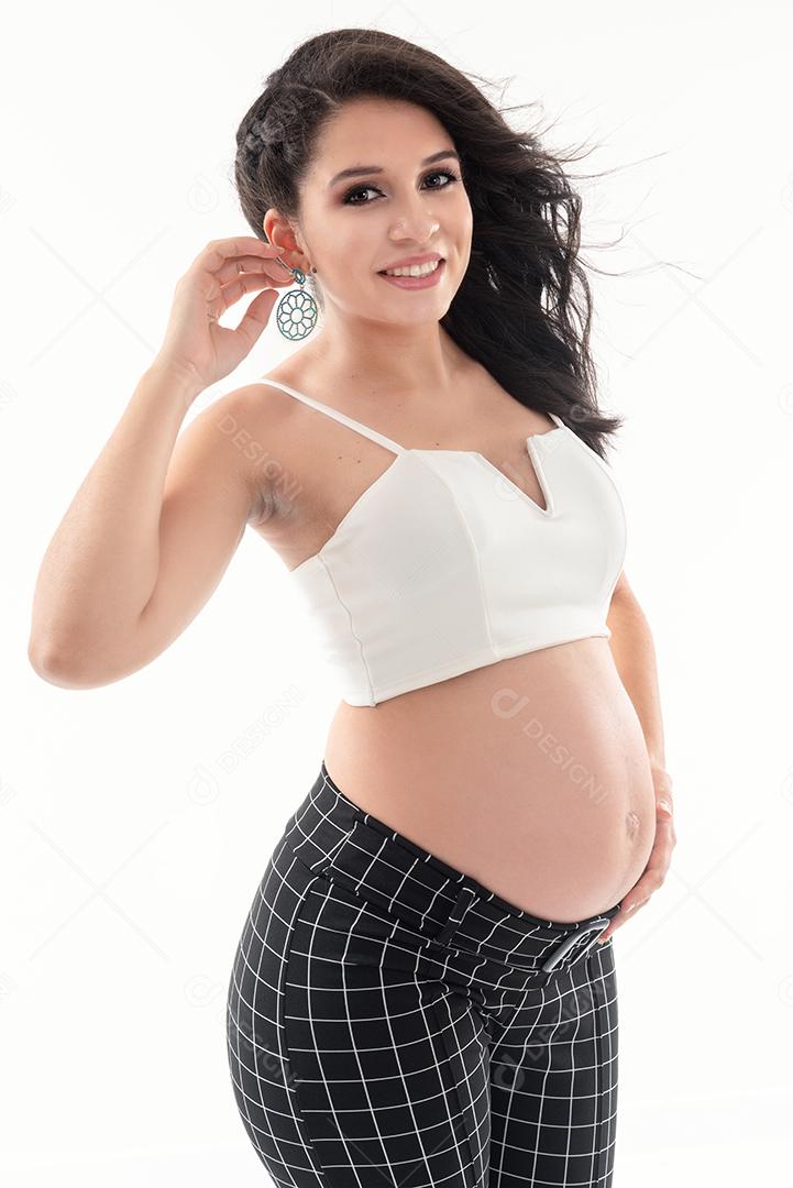 Feliz mulher grávida sorridente tocando sua barriga isolada