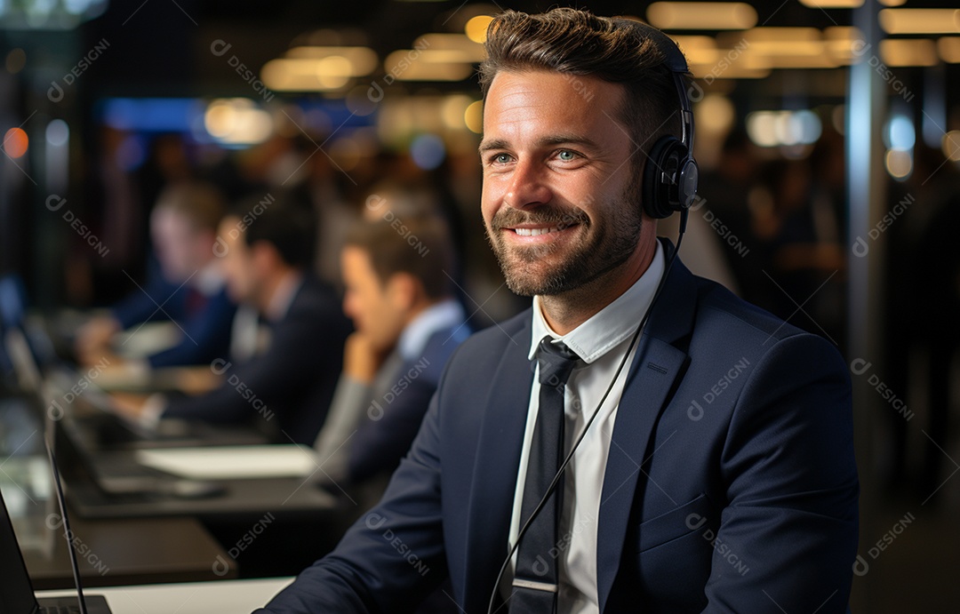 Representante de atendimento ao cliente masculino com terno, fone d...