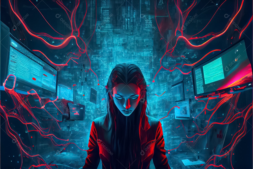 Vista aérea da mulher hacker se perguntando dentro do núcleo do com...