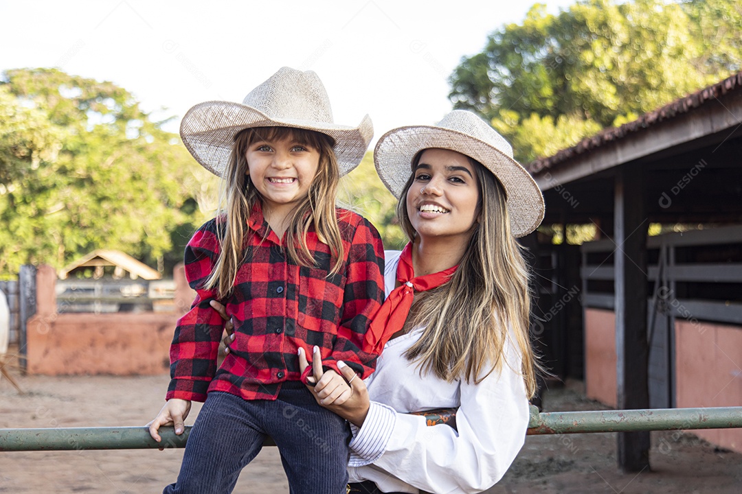 Mãe linda ao lado de sua filha sobre uma fazenda