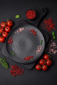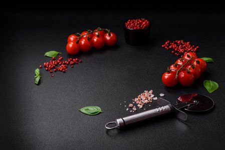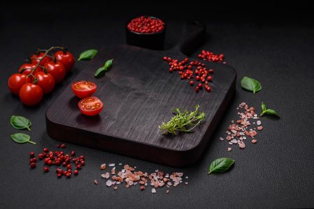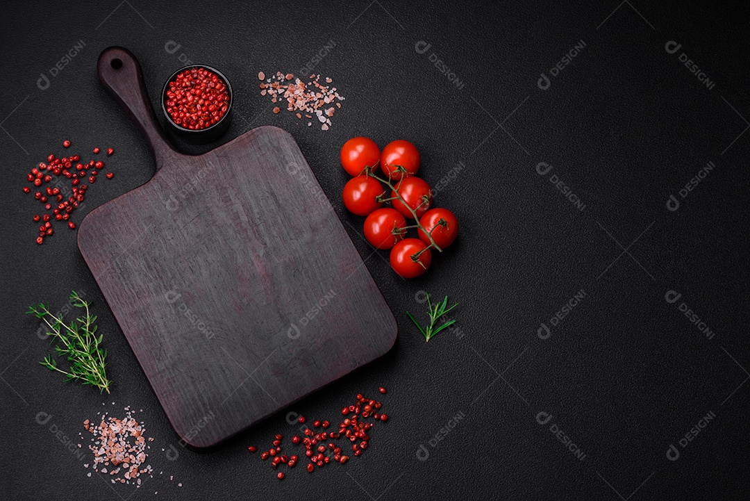 Ingredientes para cozinhar tomate cereja, sal, especiarias e ervas sobre um fundo escuro de concreto