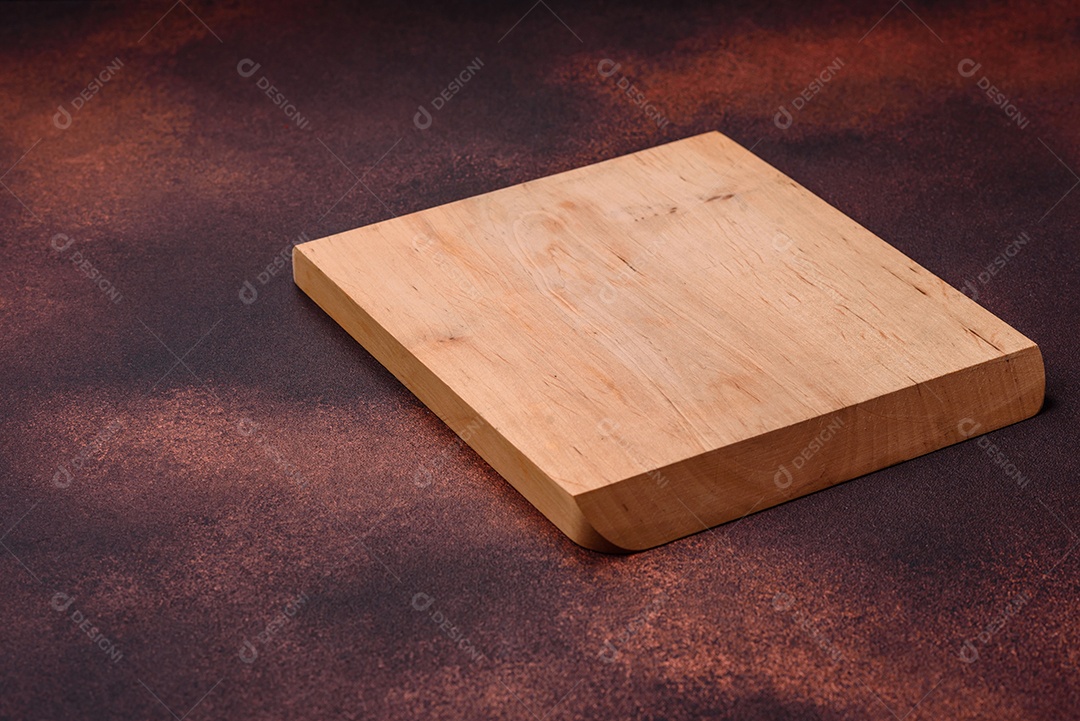 Tábua de corte de madeira retangular vazia em fundo de concreto texturizado. Cozinhando em casa