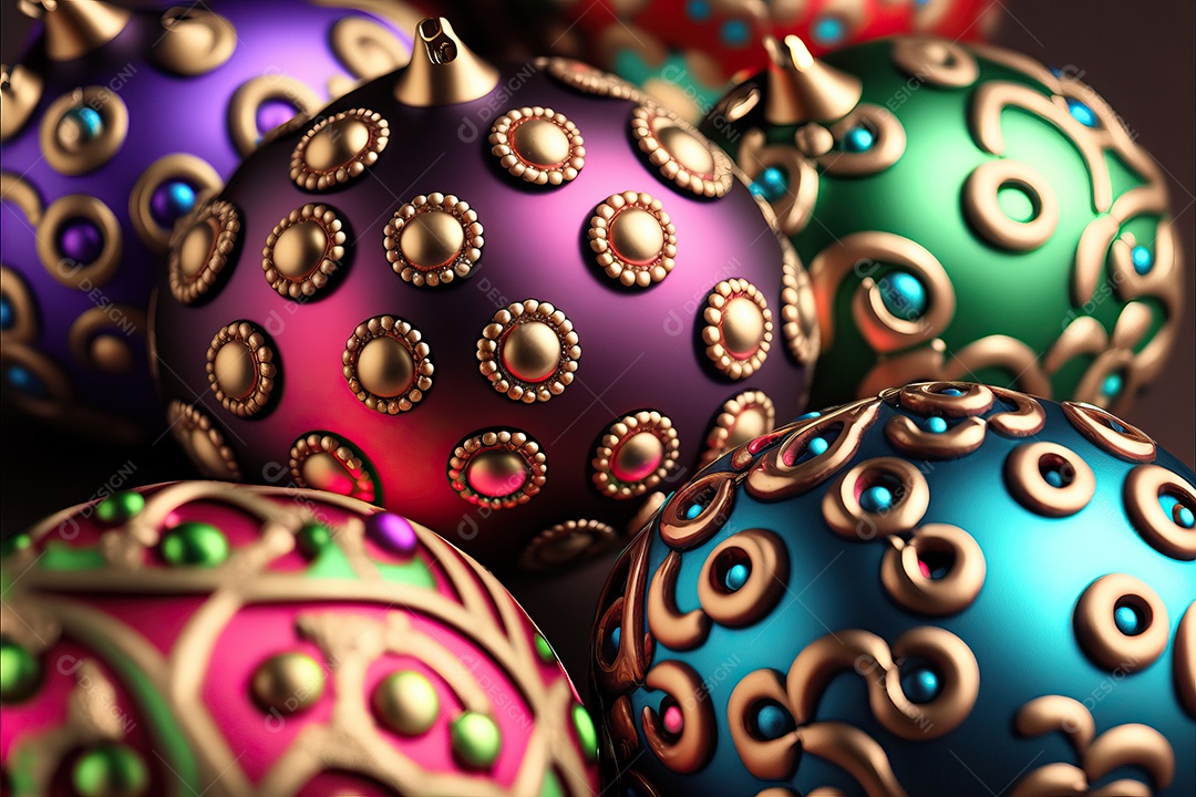 Close-up de enfeites na árvore de Natal com guirlandas em fundo colorido com foco seletivo e fundo desfocado.