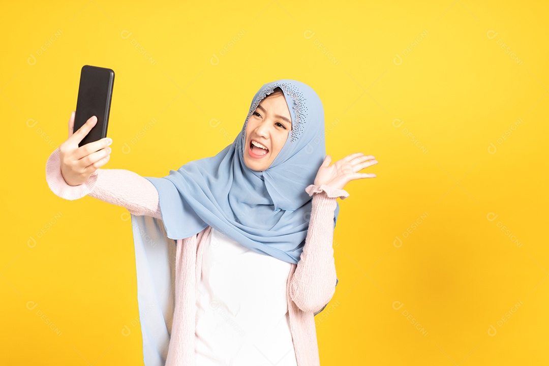 Retrato de menina muçulmana asiática em hijab em fundo amarelo