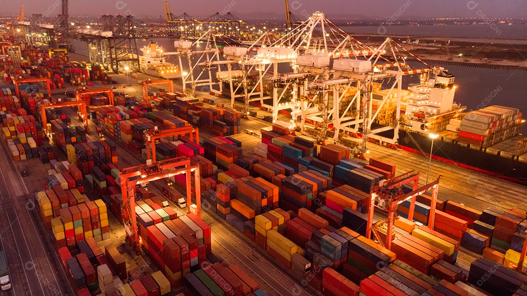 Antena de guindaste de carga e tanque grande de contêiner no porto de pátio terminal internacional, navio de carga sob trabalho de carregamento de guindaste e serviço no porto de pátio.