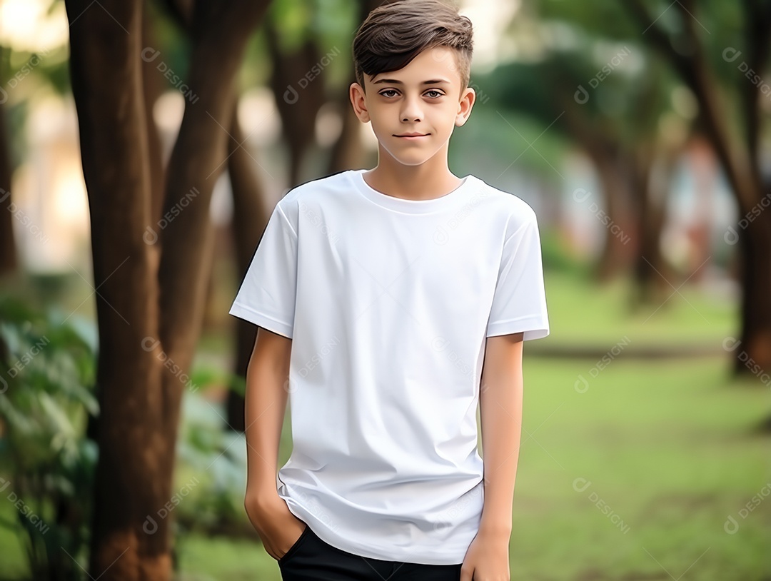 Garoto bonito vestindo maquete de camiseta branca vazia em branco para modelo de design