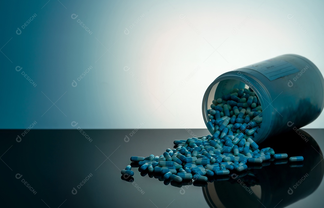 Comprimido de cápsula azul e branco derramado de garrafa de plástic...