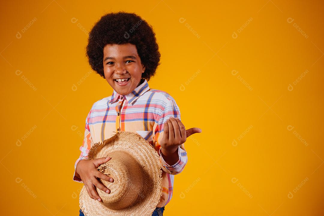 Retrato de um menino afro vestindo roupas típicas para a Festa Junina