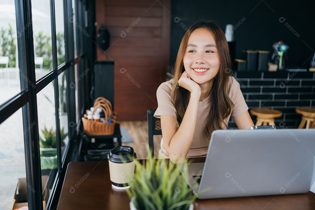 Mulher asiática freelancer freelancer sorrindo para ela trabalhando com laptop e smartphone