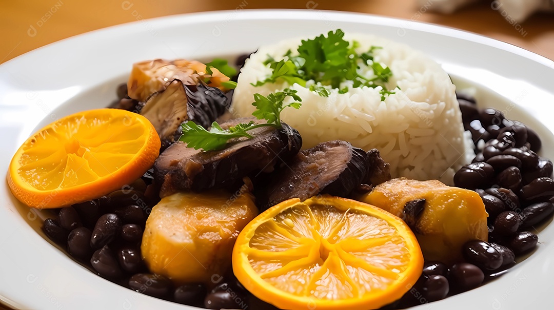 Feijoada tradicional brasileira com feijão preto, carne de porco, arro