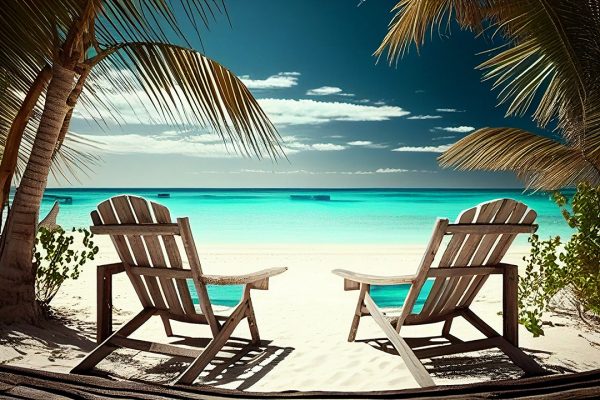 Lindas cadeiras de praia sobre areia do mar conceito  férias de verão gerado por IA