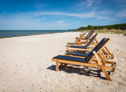 Lindas cadeiras de praia sobre areia do mar conceito férias de ver...
