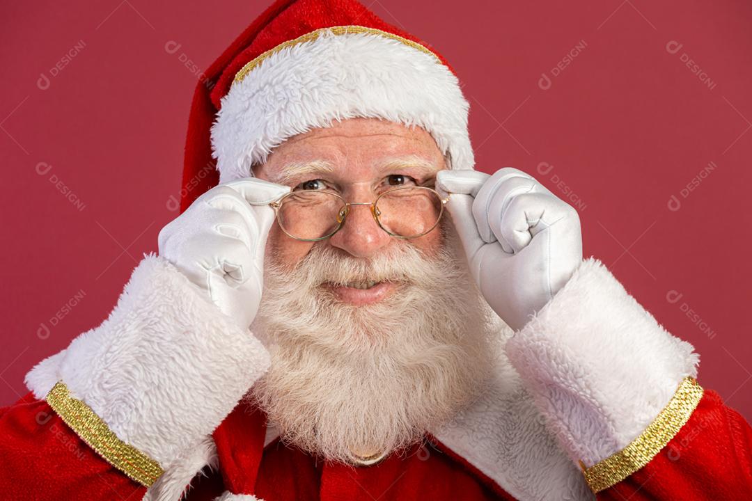 Papai Noel olhando para a câmera. O Natal está chegando. Feliz Natal. Papai Noel está assistindo. Segurando os óculos.