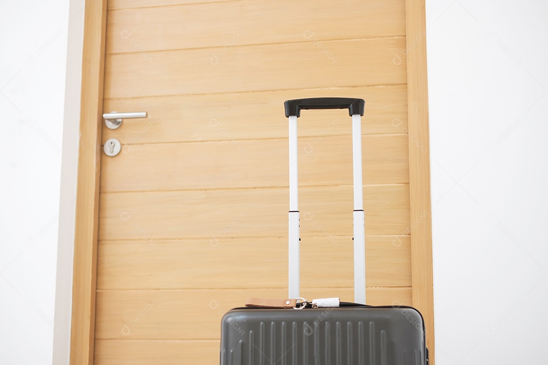Bagagem preta perto da porta no quarto de hotel moderno. Tempo para...