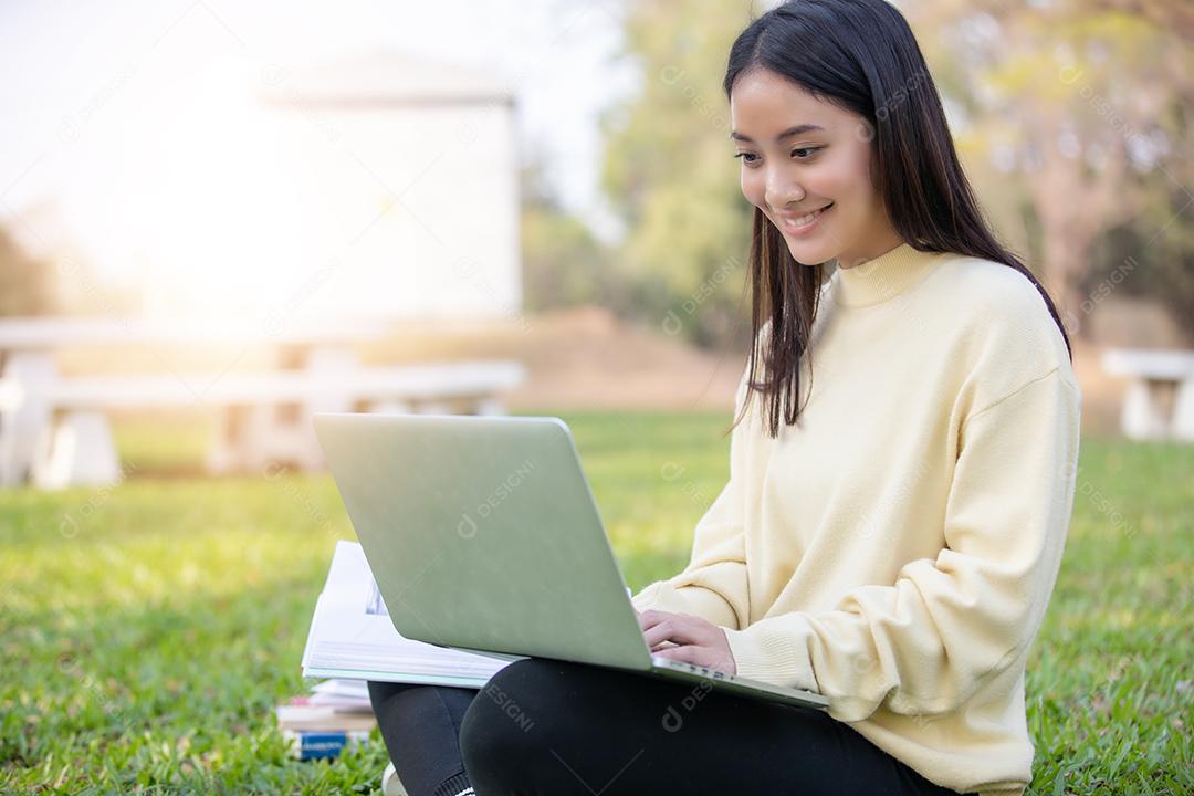 Mulher asiática Estudantes universitários sorrindo e sentados na grama verde Trabalhando e lendo Fora Juntos em um parque