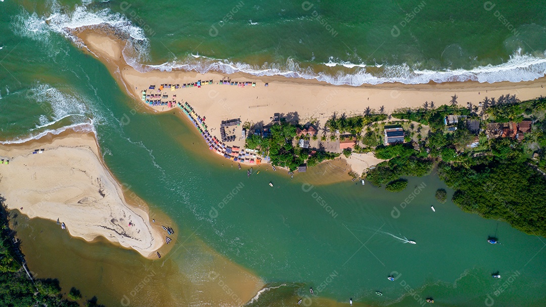 Vista aérea da praia de Caraiva, Porto Seguro, Bahia, Brasil. Barracas de praia coloridas, mar e rio.