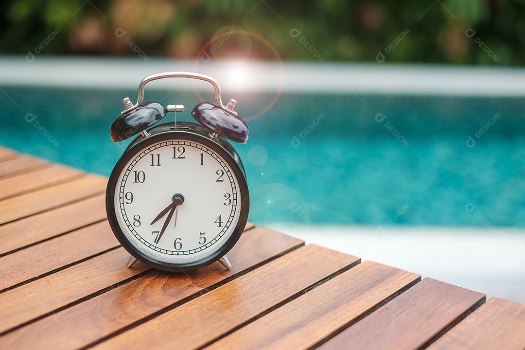 Despertador vintage na mesa de madeira e copie o espaço para texto.