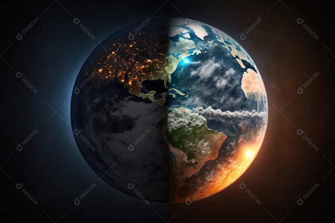 Bela imagem da terra noite e dia em visão detalhada de um satélite no espaço orbitando com o planeta Terra