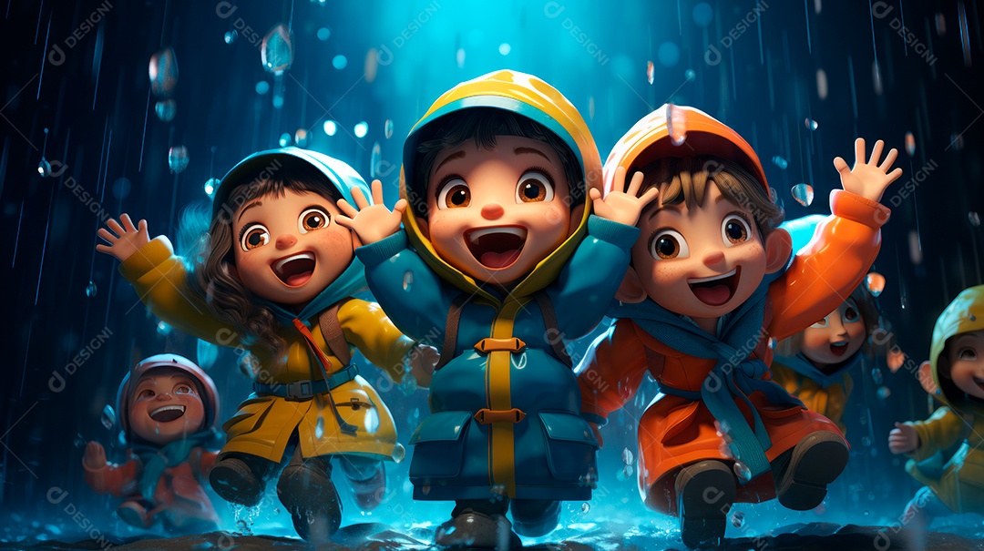 Personagens de desenhos animados de crianças brincando na chuva. Estação chuvosa, estilo cartoon, IA generativa 3D.