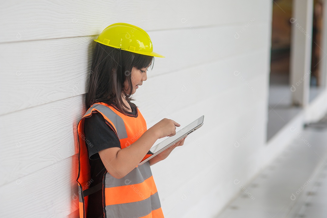 Menina asiática de retrato vestindo uma camisa reflexiva e chapéu duro