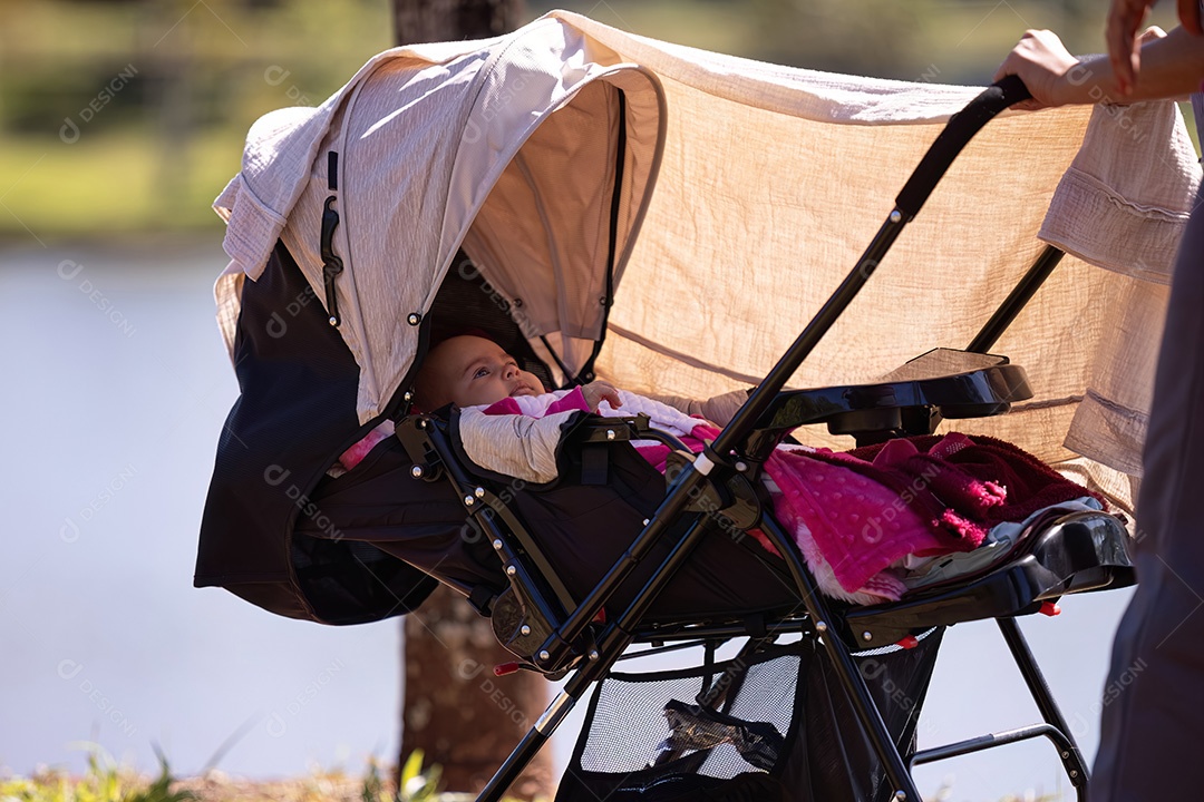 Carrinho de bebê com bebê recém-nascido sendo carregado pela mãe