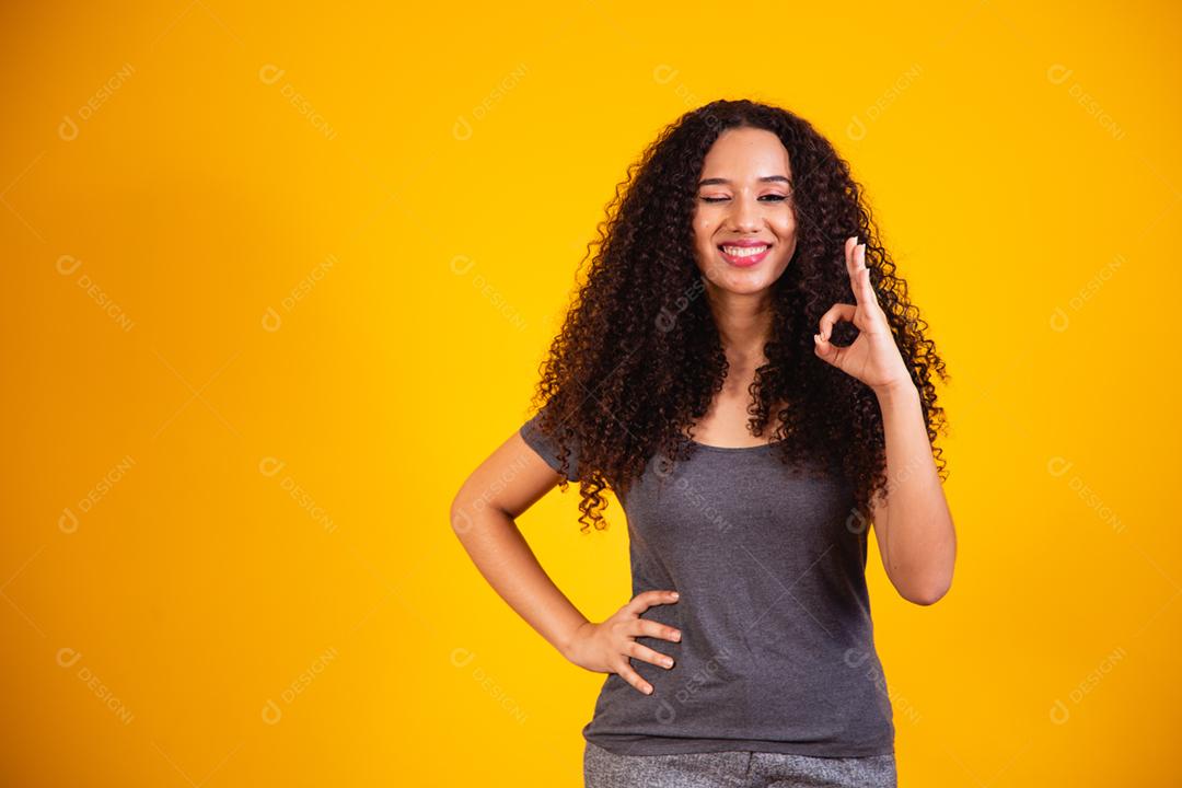 Linda garota de cabelos cacheados usando as mãos okey sinal. Costas amarelas