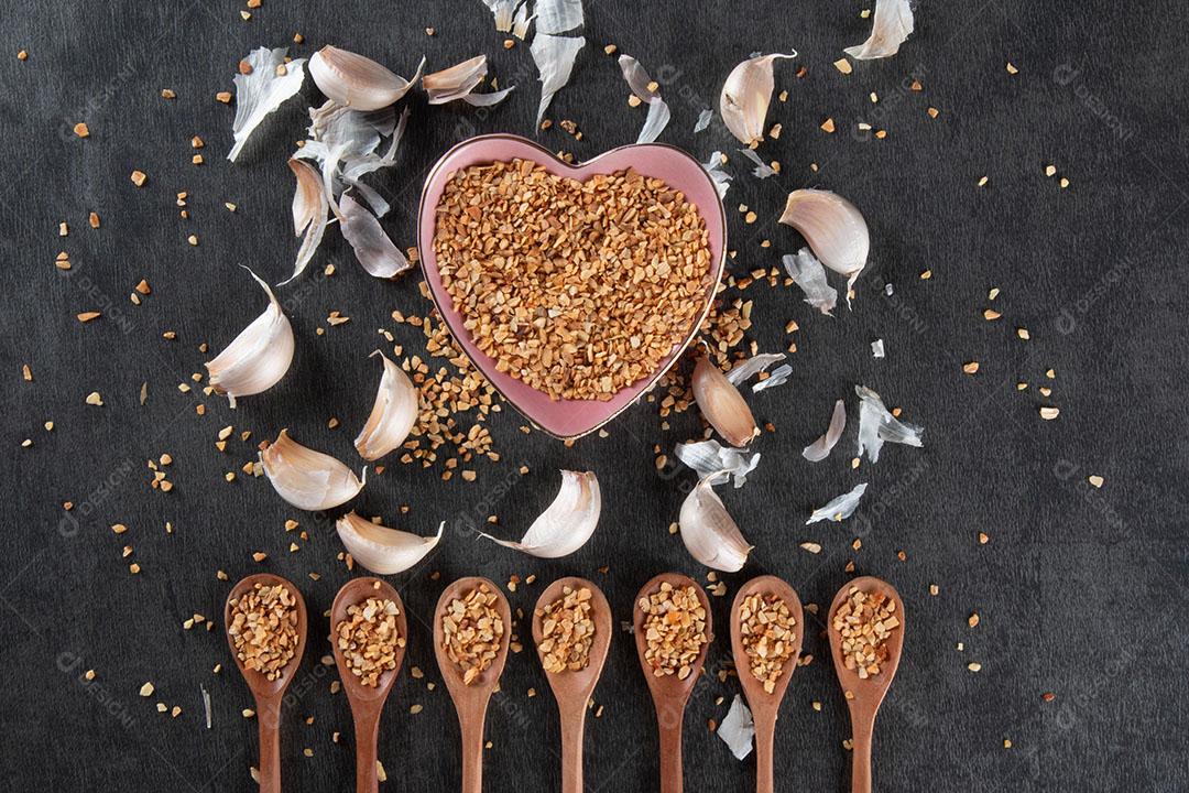 Dentes de Alho e Bulbo na Tigela de Coração Com Fundo Escuro Imagem JPG
