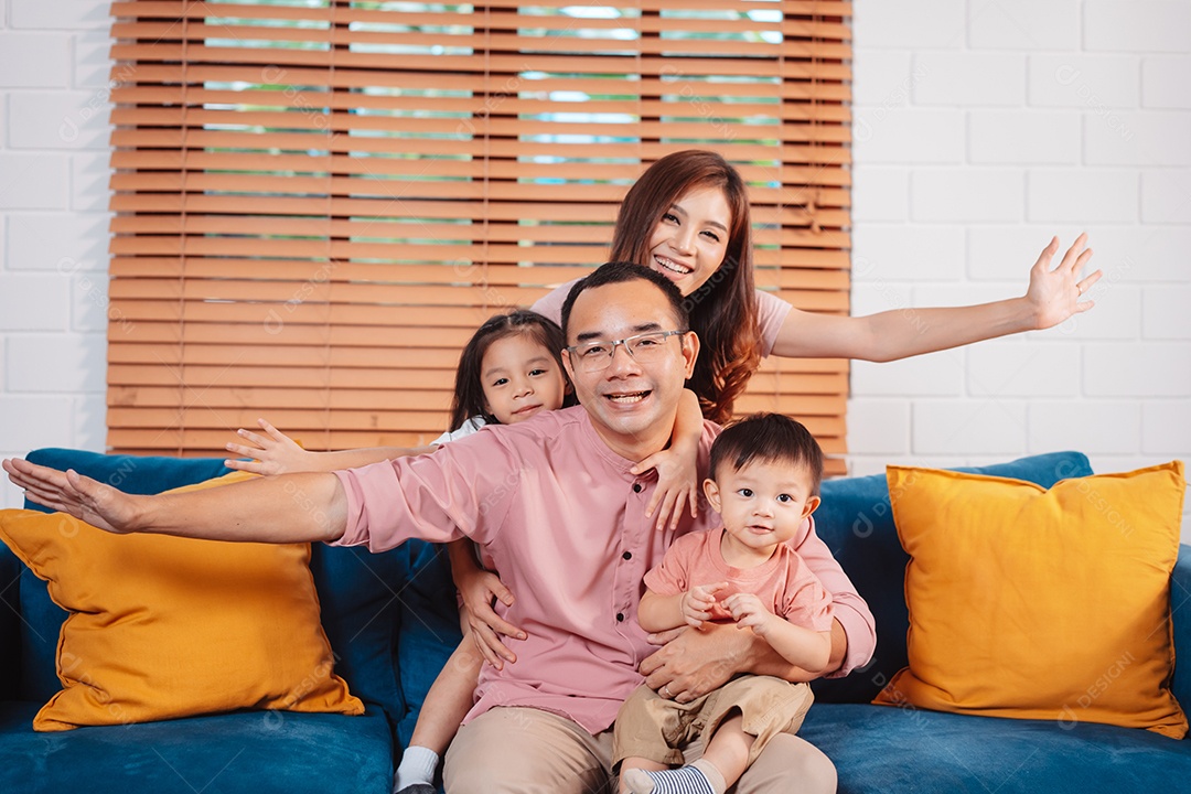 Feliz família asiática aproveitando o fim de semana relaxa no sofá ...