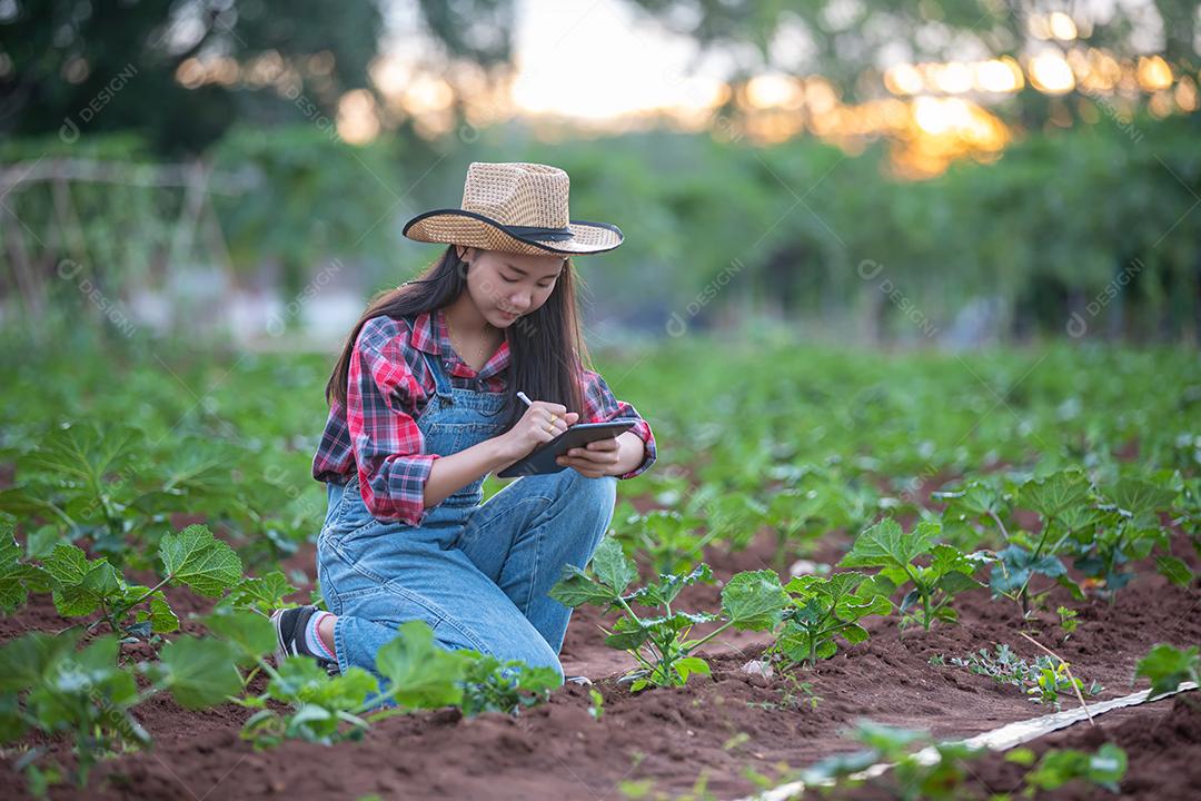 Mulheres da Ásia Agrônoma e agricultora usando tecnologia para inspecionar em campo de vegetais agrícolas e orgânicos