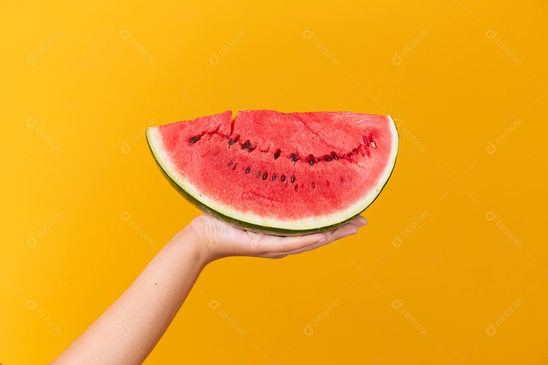 mão feminina segurando um pedaço de melancia em fundo amarelo w