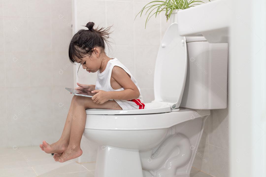 criança sentada no vaso sanitário segurando o tablet. conceito de s...