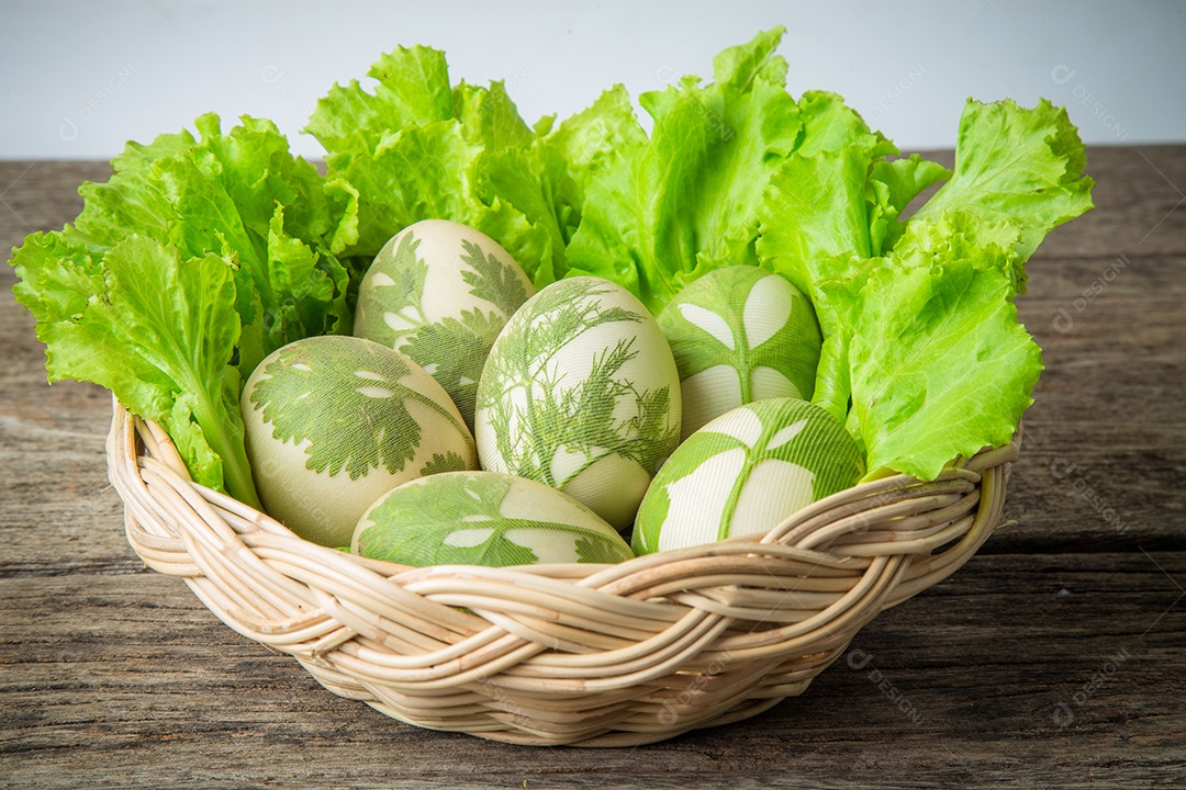 Ovos de Páscoa na cesta em pranchas de madeira rústicas.