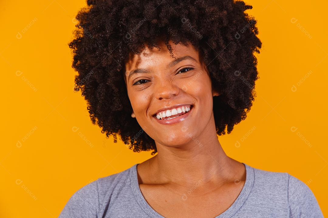 Linda garota afro-americana com um penteado afro sorrindo. Mulher c...