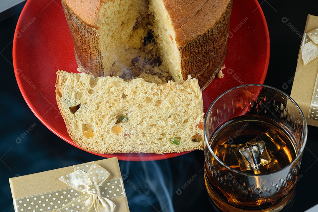 Closeup da fatia de panetone sob a fumaça do cigarro, ao lado de um copo com uísque e caixas de presente